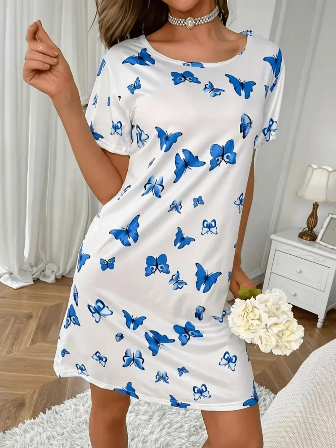 Drift off to dreamland in this charming butterfly print nightgown. The delicate butterfly pattern adds whimsical charm while the soft, breathable fabric ensures comfortable sleep all night long. The loose, relaxed fit allows for unrestricted movement and maximum comfort, while the short sleeves keep you cool during warm nights. Crafted from high-quality, lightweight fabric, this nightgown feels gentle against your skin and becomes even softer with each wash. Perfect for sleeping, lounging around the house, or lazy weekend mornings—this versatile sleepwear transitions effortlessly from bedtime to breakfast. The casual design makes it ideal for warm weather or year-round comfort in climate-controlled homes. The butterfly print brings a touch of nature-inspired beauty to your nighttime routine. Pair with cozy slippers for the ultimate relaxation experience.